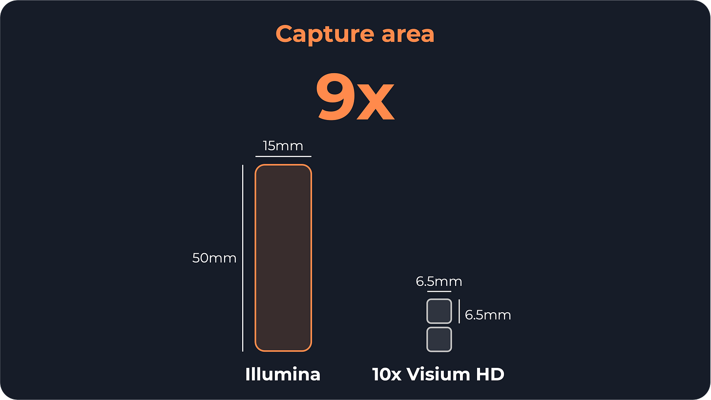 Illumina uses a 50×15 mm (7.5 cm²) slide versus a slide of two 6.5×6.5 mm capture areas in Visium HD (0.4 cm² total).