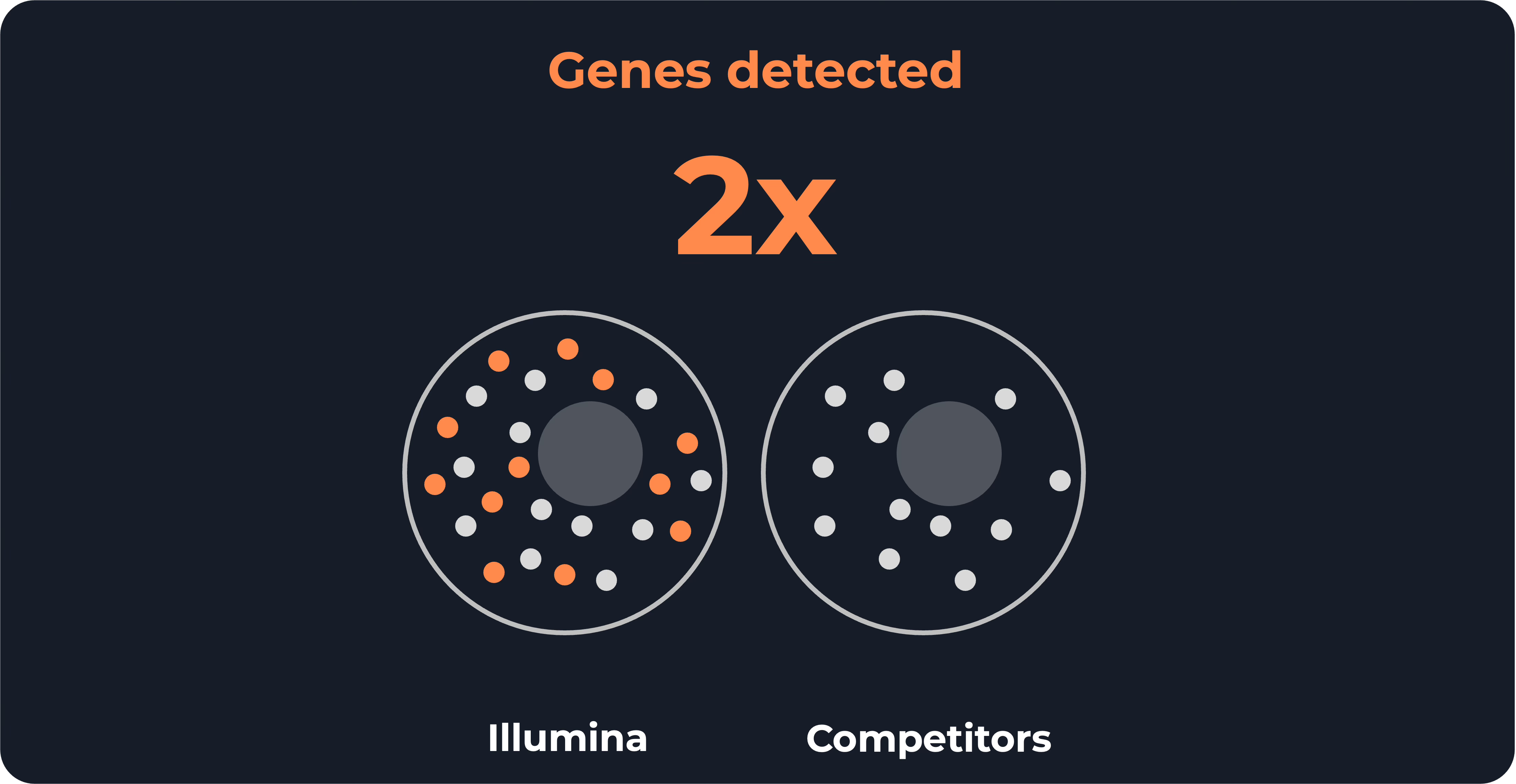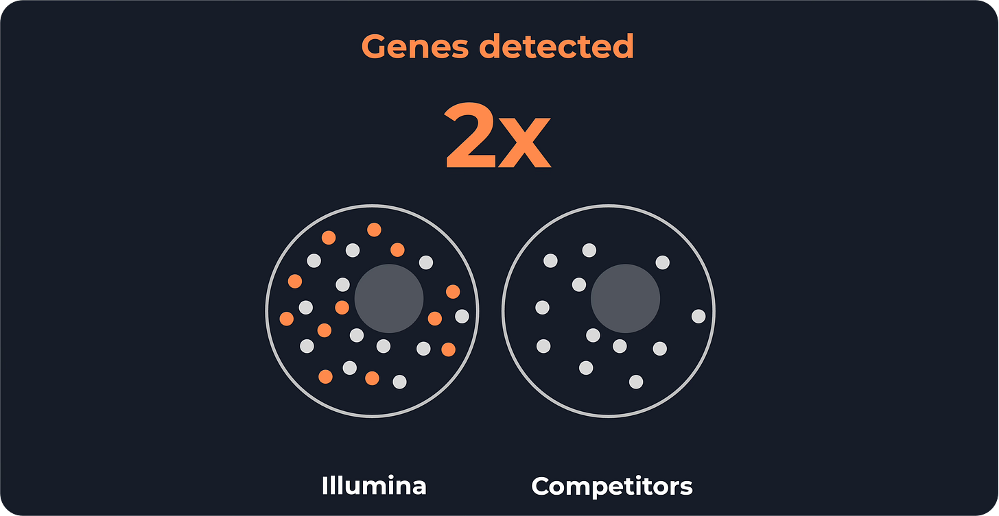 Thanks to their experience in designing flow cells, Illumina can pack in way more barcodes than the competition. This translates to better sensitivity and more genes detected.