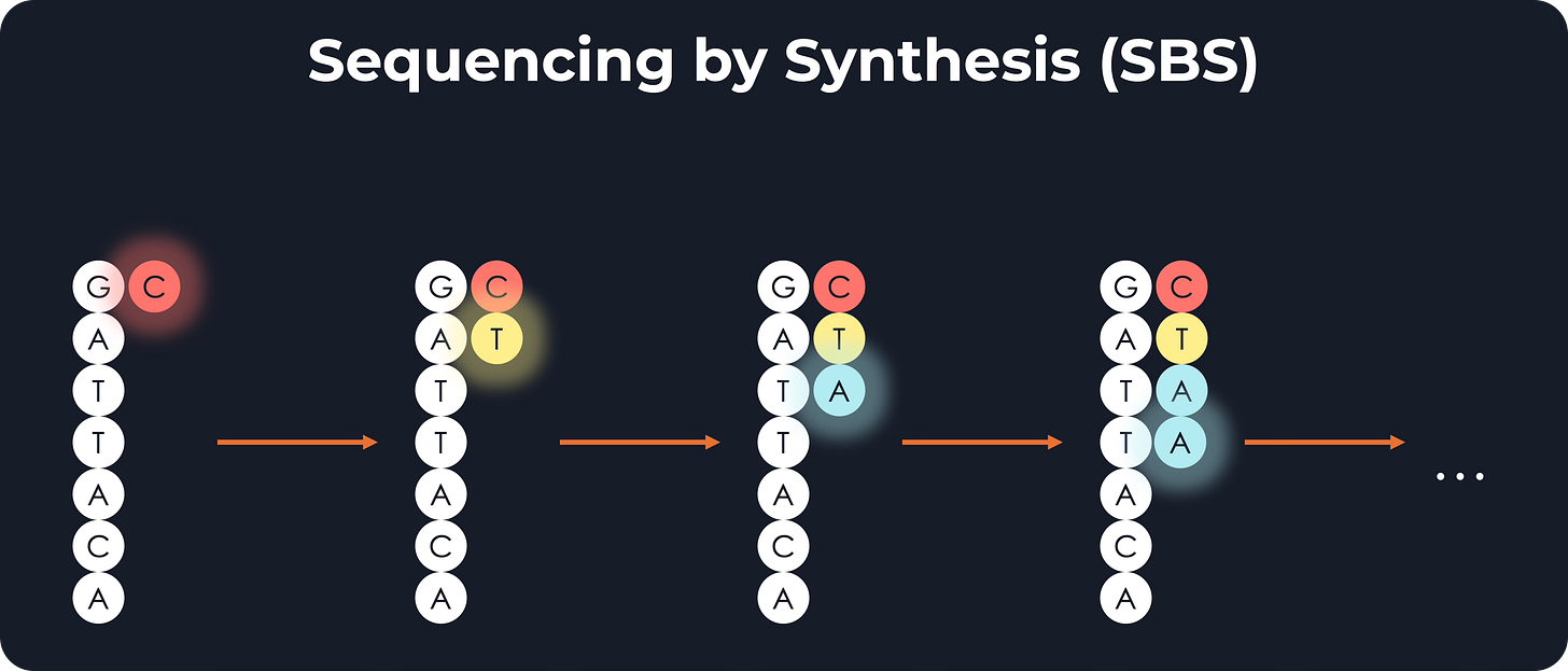 Imagine you have a molecule with the sequence GATTACA. An Illumina sequencer can read it because it has nucleotides floating around that are bound to a specific fluorescent color. As an example, A might be blue, C=red, G=green, and T=yellow. Then, these nucleotides would sequentially bind to their complementary ones in the molecule.