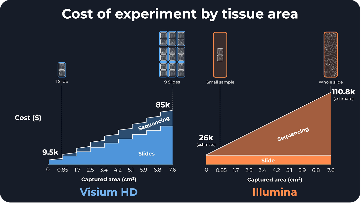 For big samples, or if you can somehow fit many samples into one slide, Illumina could be the better deal. Also because, in the case of Visium HD, you will have to pay for the people and time to run nine experiments.